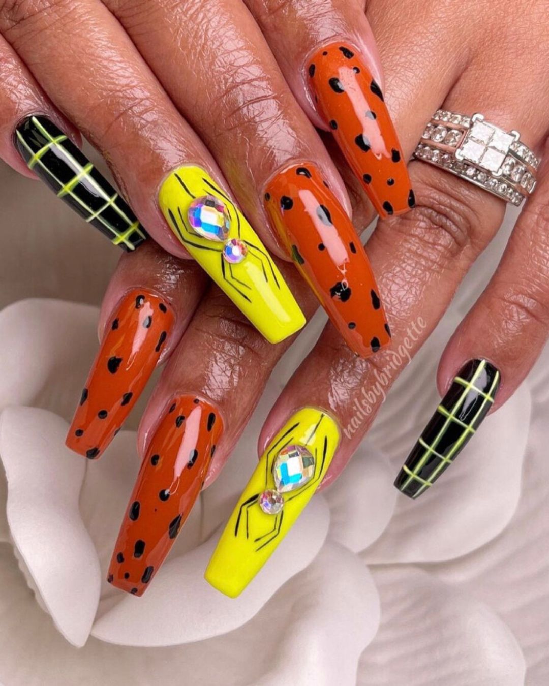 Những chú nhện đính bằng đá nhỏ xíu sẽ biến bộ nail thường ngày thành tác phẩm nghệ thuật. Hoàn hảo cho các nàng thích chút lấp lánh nhưng vẫn có yếu tố Halloween.