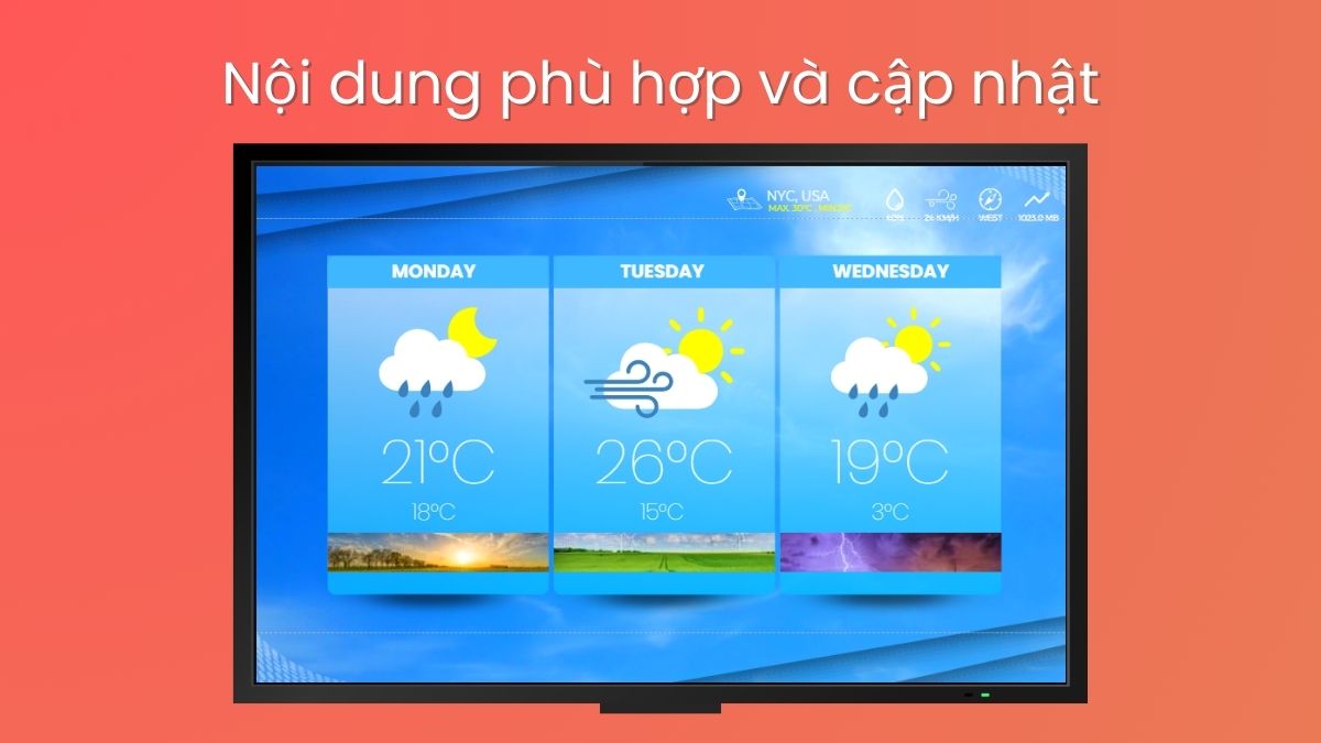 Nội dung trên màn hình cần phải liên quan đến thời điểm, mùa, sự kiện hoặc chiến dịch của doanh nghiệp. Ví dụ, việc hiển thị dự báo thời tiết cho khu vực địa phương hoặc các chương trình giảm giá theo mùa có thể tạo ra sự kết nối mạnh mẽ với khách hàng. Theo nghiên cứu, nội dung được cập nhật thường xuyên giúp tăng cường sự quan tâm của người xem lên đến 90%.