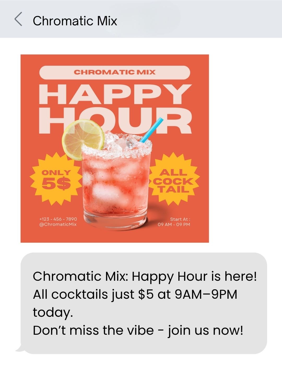 "Happy Hour từ 5–7 PM! Tất cả các loại cocktail chỉ với 5 đô la! Đừng bỏ lỡ!"