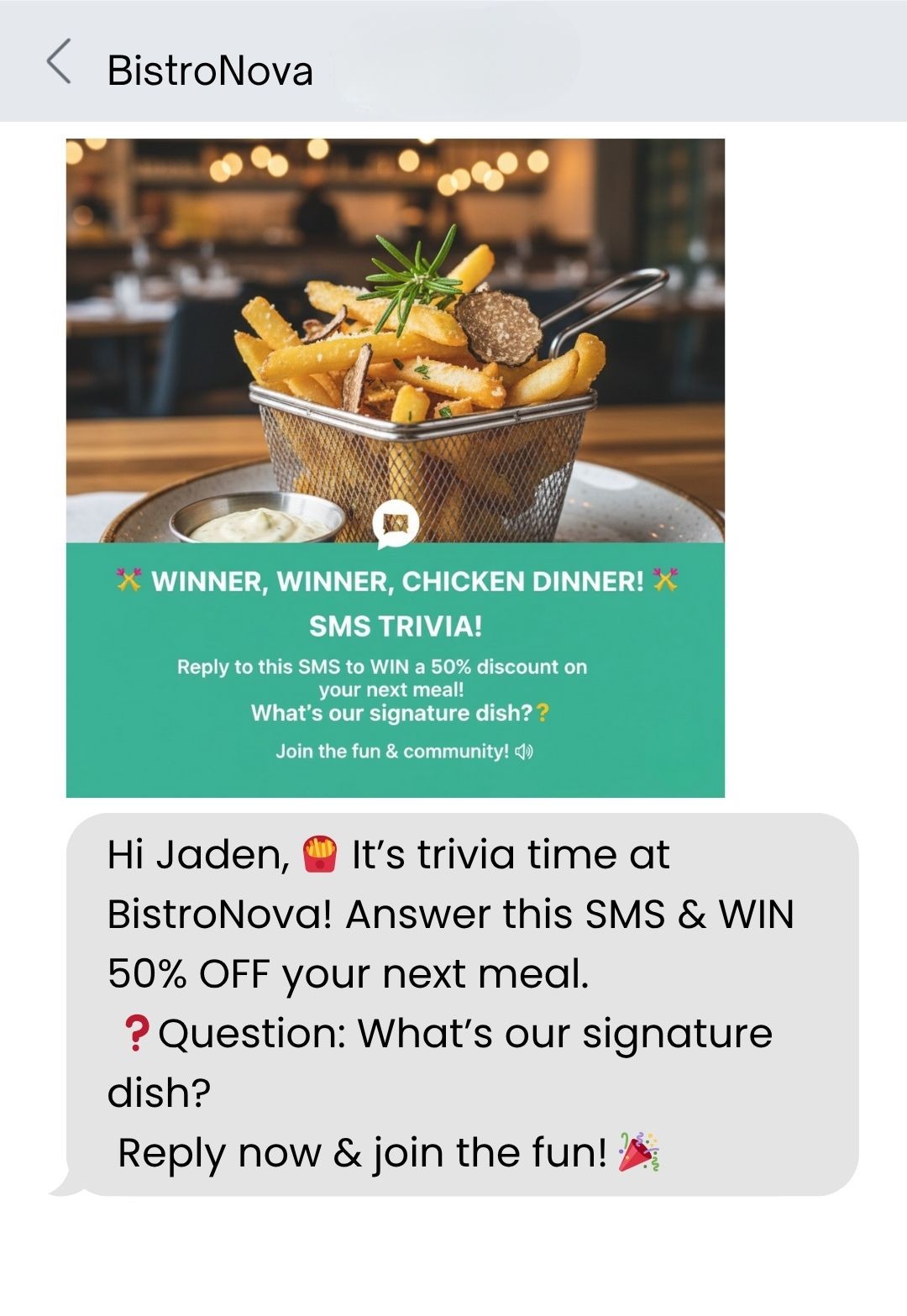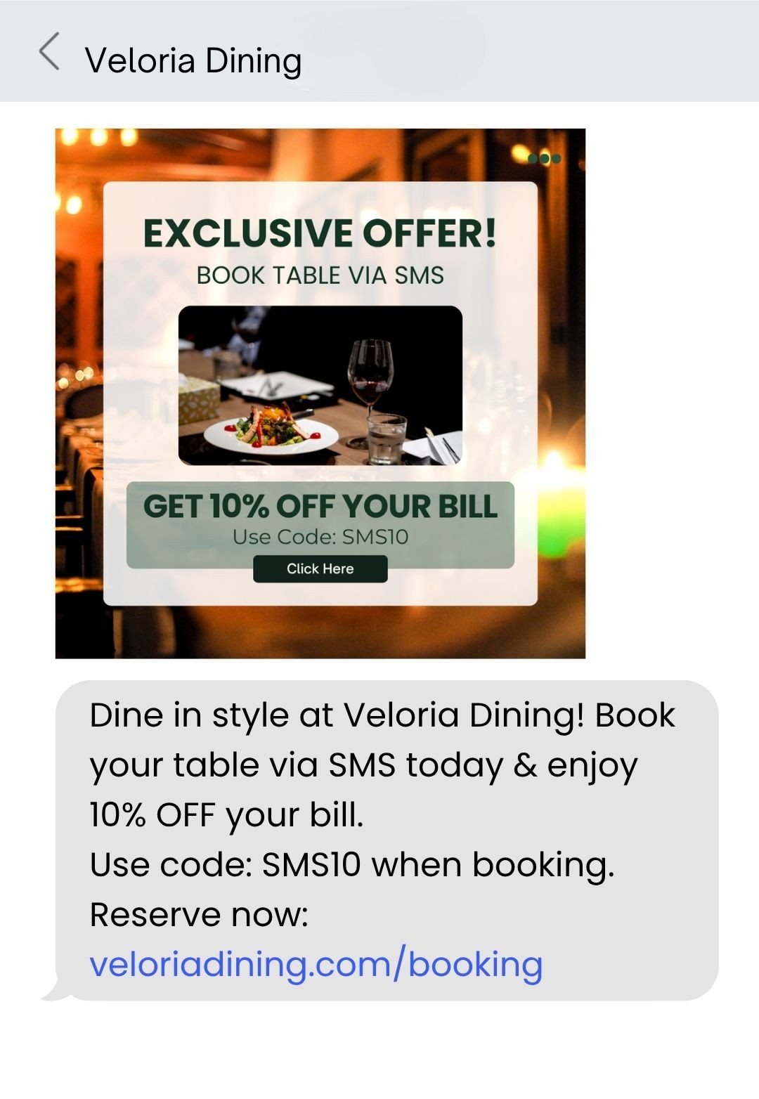 "Đặt bàn qua SMS và nhận ngay 10% giảm giá trên hóa đơn! Sử dụng mã: SMS10."