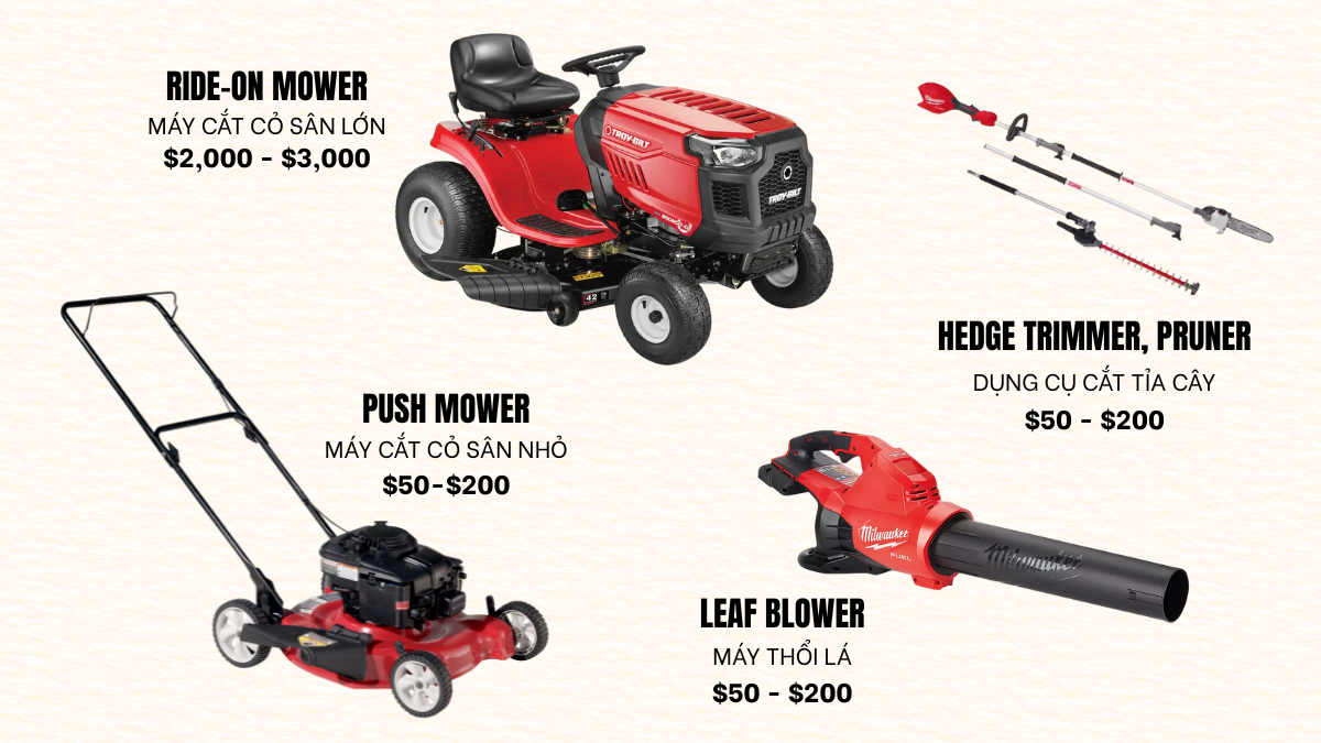 Dụng cụ cắt tỉa cây (hedge trimmer, pruner): khoảng 50–200 USD. Những dụng cụ này hỗ trợ bạn chăm sóc cây cảnh và tỉa viền sân.