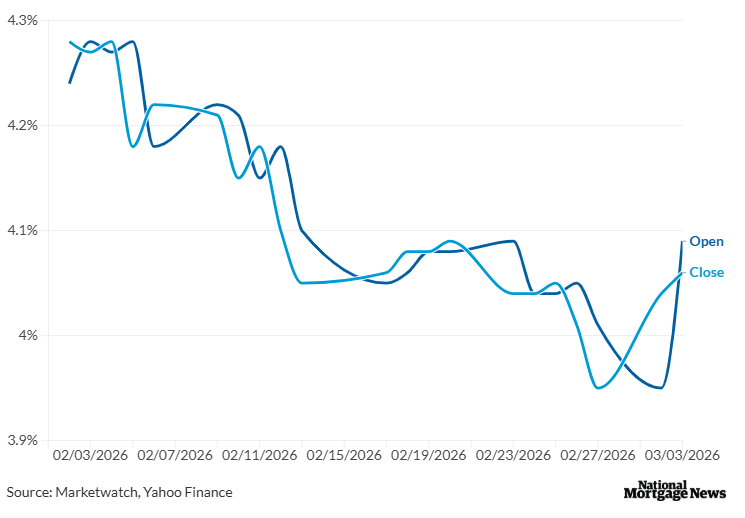 Chỉ trong vòng hai ngày sau khi căng thẳng tại Iran leo thang, lợi suất trái phiếu kho bạc Mỹ kỳ hạn 10 năm đã tăng thêm khoảng 10 điểm cơ bản. Diễn biến này nhanh chóng tác động đến thị trường bất động sản: lãi suất vay mua nhà cố định 30 năm đã tăng lên 6,35% vào sáng ngày 3 tháng 3 năm 2026.